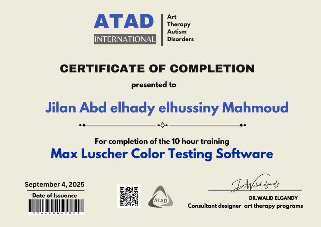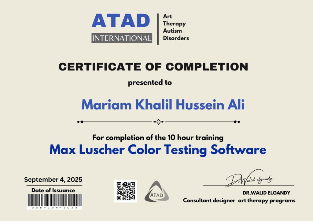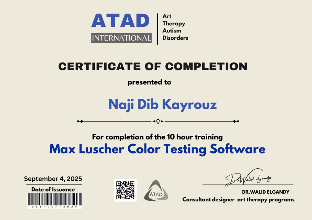 شهادة إتمام تُمنح بعد إكمال التدريب في برنامج إختبار ماكس لوشر للألوان